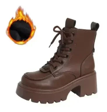 7CM New Winter Women Warm Snow Shoes Round Toe Chunky Heels Ankle Boots High Platform Leather Shoes for Women Combat Short Boots