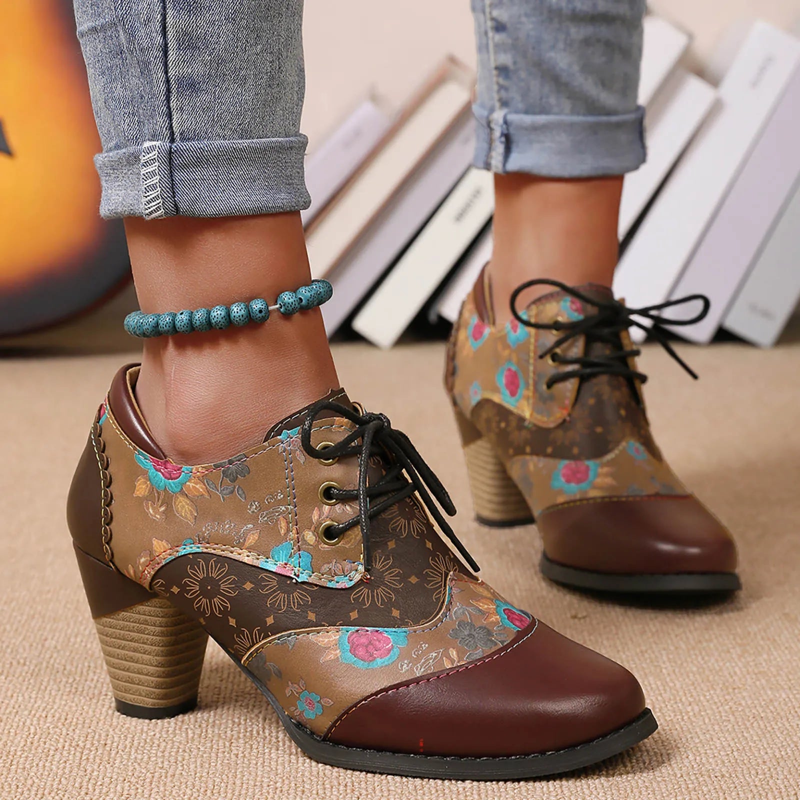 Bohemian Women PU Leather Shoes Ethnic Style Lace Up Fashion Casual Vintage Shoes Zipper High Heel Short Boots Botas Mujer