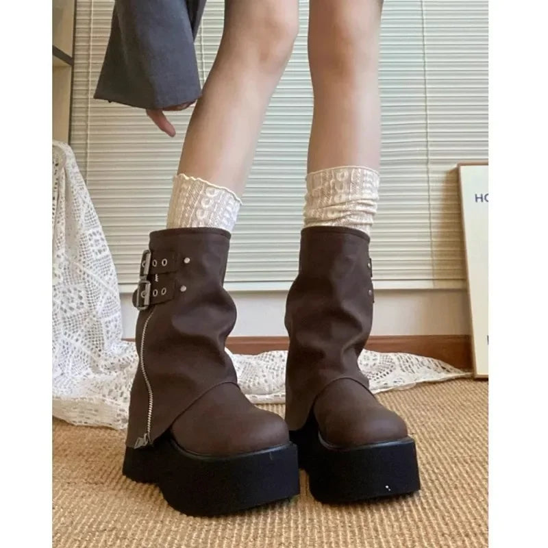 Tassel Boots for Women Retro Gothic Trend Women Boots Chelsea Mid Heels Motorcycle Boots Women Fashion Knee High Botas